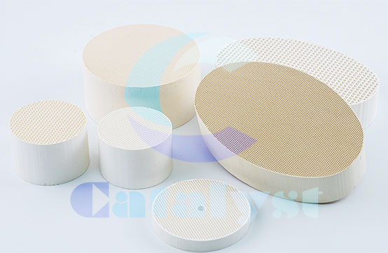 陶瓷載體的材質是青堇石(cordierite:2MgO.2Al2O2.5SiO2),其陶瓷壁上需洗覆(washcoating)一γ-Al2O3,以增加載體的表面積,再將觸媒金屬(鉑、鈀、銠)置放於上。蜂巢式觸媒的特性是低熱膨脹性、體積小、低壓降和低振動磨損等。 催化轉化器係減低一氧化碳(CO),碳氫化合物(HC),氮氧化物(NOx)之污染裝置,當車輛排放出的廢氣,經過轉化器時,氮氧化物被還原為氮氣與氧氣,一氧化碳與碳氫化合物則氧化成二氧化碳與水。